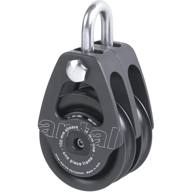 A complete range from 50 to 140 mm sheaves in single, double, triple, fiddle, and deck versions, for webbing or shackle connection. Sizes are based on the range of HR shackles available and on their safe working load (SWL). The HR swivel head. Made in high resistance stainless steel, with three positions: swivelling head, longitudinal lock and transversal lock. HR shackles included. The one-piece-frame. The one-piece aluminium extruded body is the strongest and lightest solution, no assembling pin rivets or screws and nuts. CNC machined - polished - hard black anodized and teflon coated. The composite fibre sheave. The resin (aluminium on larger mod) sheave runs on the main Composite Fibre bearing and on a ground stainless steel hub: low friction highloads - no lubricant required. The self-captive side ball bearing reduces the friction and makes disassemb