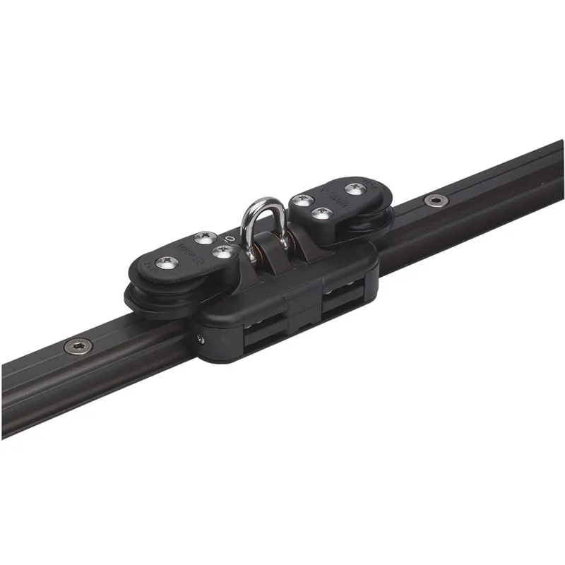 Car with 2 sheaves with Shackle. Ball bearing car in hard black anodized aluminum with four ball circuits: 2 Torlon ball circuits (lower) and 2 Delrin ball circuits (upper). The car will remain on the track even after ball bearing failure (overload). Side windows for easy maintenance and ball bearing cleaning and/or replacement. The car, the track and all components are extruded in high strength alloy and hard black anodized. (Steel parts: AISI 316)