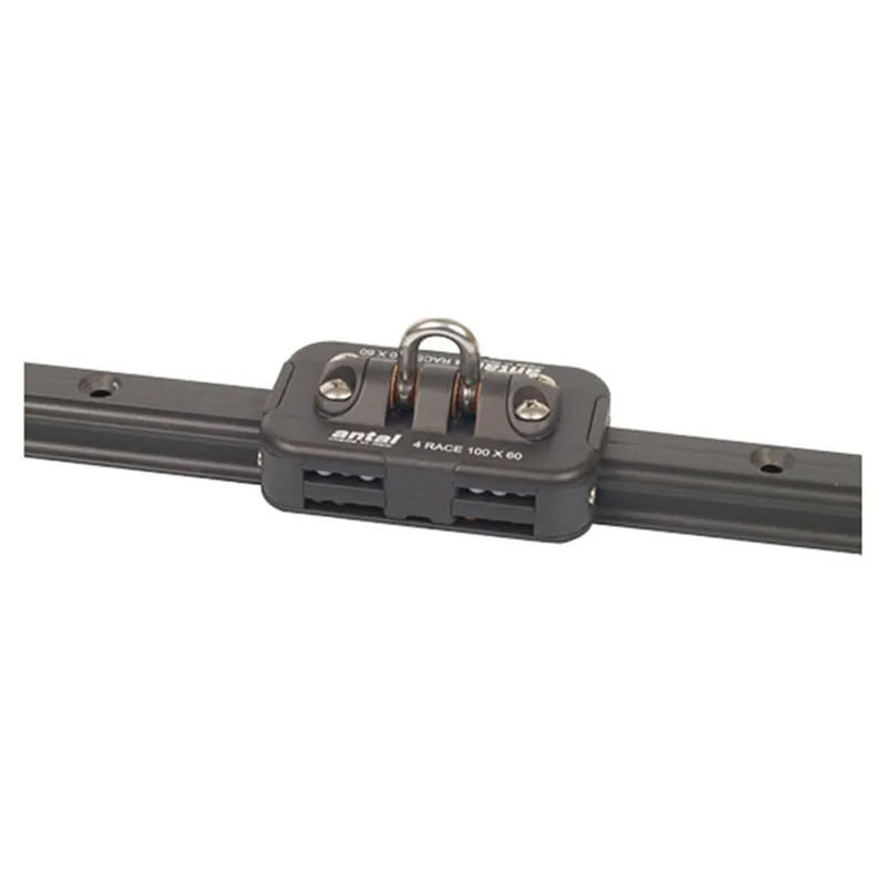 Car with shackle. Ball bearing car in hard black anodized aluminum with four ball circuits: 2 Torlon ball circuits (lower) and 2 Delrin ball circuits (upper). The car will remain on the track even after ball bearing failure (overload). Side windows for easy maintenance and ball bearing cleaning and/or replacement. The car, the track and all components are extruded in high strength alloy and hard black anodized. (Steel parts: AISI 316)