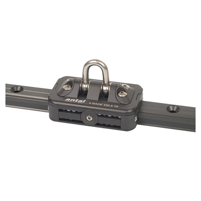 Car with shackle. Ball bearing car in hard black anodized aluminum with four ball circuits: 2 Torlon ball circuits (lower) and 2 Delrin ball circuits (upper). The car will remain on the track even after ball bearing failure (overload). Side windows for easy maintenance and ball bearing cleaning and/or replacement. The car, the track and all components are extruded in high strength alloy and hard black anodized. (Steel parts: AISI 316)