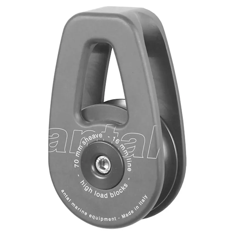These small and light blocks are the best solution for very high loads when sliding is not important. The very small sheave is fitted with a Composite Fibre bushing. The one piece frame is made for line connection. The 3 blocks (D=30, 40 and 55 mm) give an 8 to 1 system. This system is specially designed for the backstay or the boom-vang. Now available in 70mm sheave.