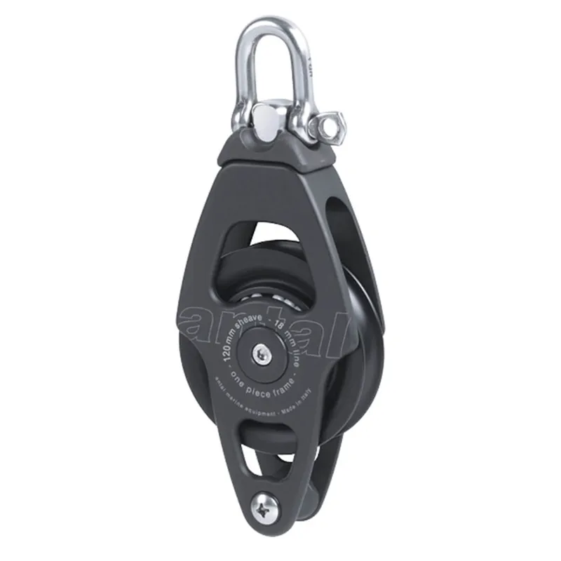 A complete range from 50 to 140 mm sheaves in single, double, triple, fiddle, and deck versions, for webbing or shackle connection. Sizes are based on the range of HR shackles available and on their safe working load (SWL). The HR swivel head. Made in high resistance stainless steel, with three positions: swivelling head, longitudinal lock and transversal lock. HR shackles included. The one-piece-frame. The one-piece aluminium extruded body is the strongest and lightest solution, no assembling pin rivets or screws and nuts. CNC machined - polished - hard black anodized and teflon coated. The composite fibre sheave. The resin (aluminium on larger mod) sheave runs on the main Composite Fibre bearing and on a ground stainless steel hub: low friction highloads - no lubricant required. The self-captive side ball bearing reduces the friction and makes disassembling, cleaning and maintenance very easy. Sheaves are supplied with the s.steel hub, they are available separately.