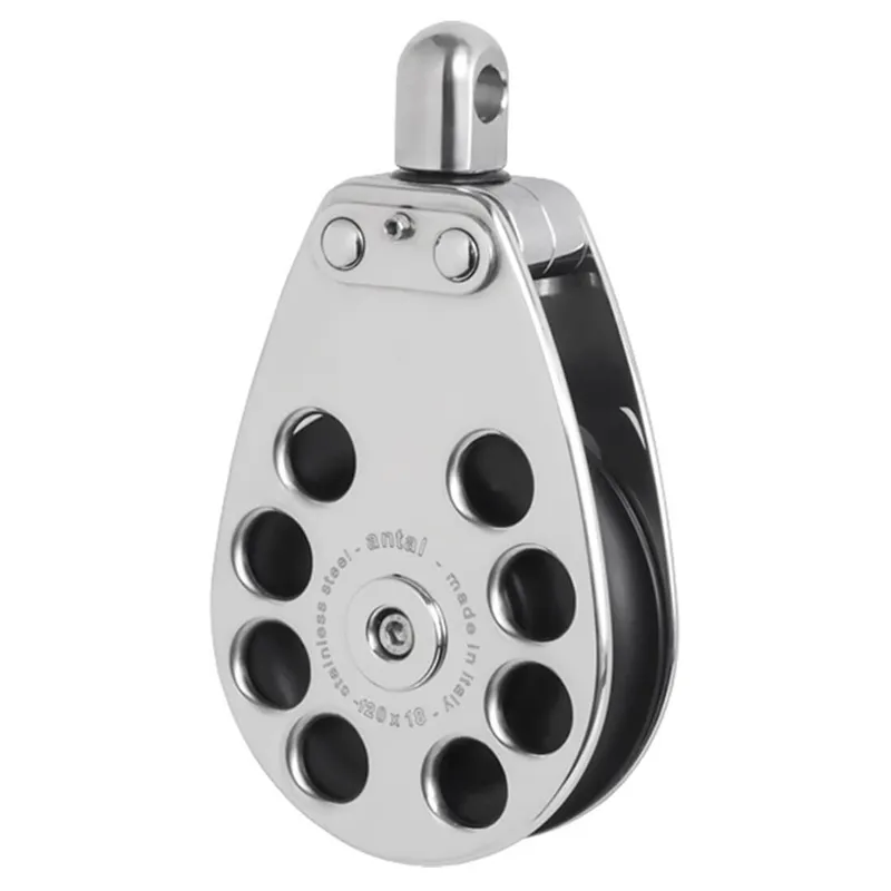 The line includes 6 different sizes with diameters from 65 to 180 mm and Safe Working Load up to 9000 kg. Perfectly polished AISI 316 stainless steel cheekplates and accessories, fully rounded corners for greater manageability, nuts and bolts replaced by pins and recessed screws to eliminate any protruding parts. The composite fibre sheave. The resin (aluminium on larger mod) sheave runs on the main Composite Fibre bearing and on a ground s.steel hub: low friction highloads - no lubricant required. The self-captive side ball bearing reduces the friction and makes disassembling, cleaning and maintenance very easy.