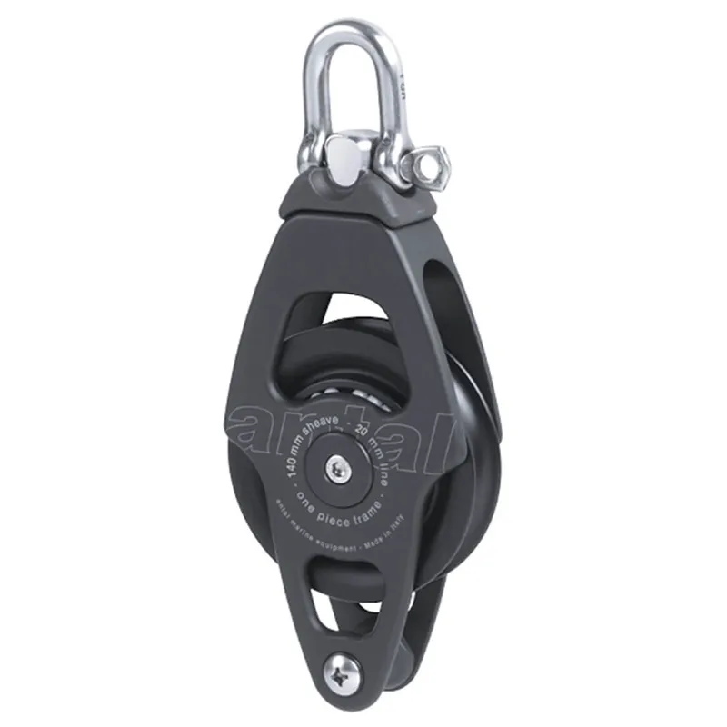 A complete range from 50 to 140 mm sheaves in single, double, triple, fiddle, and deck versions, for webbing or shackle connection. Sizes are based on the range of HR shackles available and on their safe working load (SWL). The HR swivel head. Made in high resistance stainless steel, with three positions: swivelling head, longitudinal lock and transversal lock. HR shackles included. The one-piece-frame. The one-piece aluminium extruded body is the strongest and lightest solution, no assembling pin rivets or screws and nuts. CNC machined - polished - hard black anodized and teflon coated. The composite fibre sheave. The resin (aluminium on larger mod) sheave runs on the main Composite Fibre bearing and on a ground stainless steel hub: low friction highloads - no lubricant required. The self-captive side ball bearing reduces the friction and makes disassembling, cleaning and maintenance very easy. Sheaves are supplied with the s.steel hub, they are available separately.