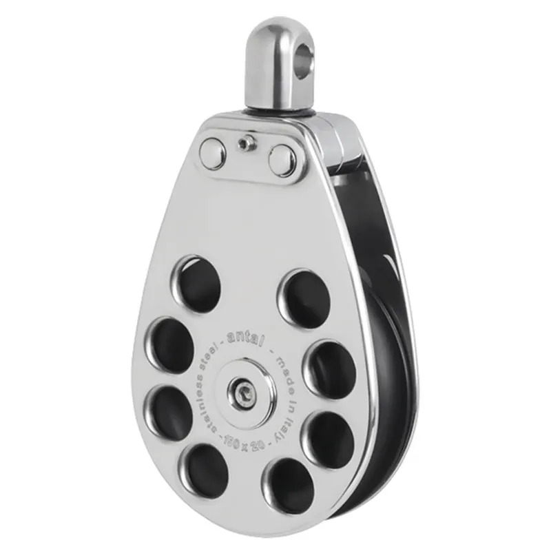 The line includes 6 different sizes with diameters from 65 to 180 mm and Safe Working Load up to 9000 kg. Perfectly polished AISI 316 stainless steel cheekplates and accessories, fully rounded corners for greater manageability, nuts and bolts replaced by pins and recessed screws to eliminate any protruding parts. The composite fibre sheave. The resin (aluminium on larger mod) sheave runs on the main Composite Fibre bearing and on a ground s.steel hub: low friction highloads - no lubricant required. The self-captive side ball bearing reduces the friction and makes disassembling, cleaning and maintenance very easy.