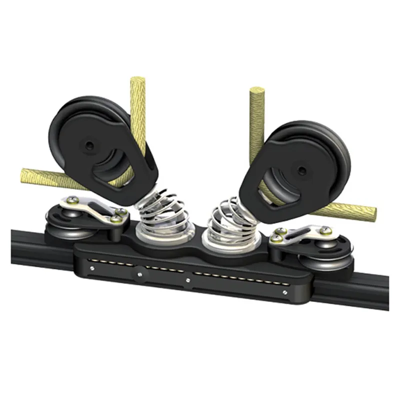 Car with 1 sheave + becket 2 blocks. Ball bearing car in hard black anodized aluminum with four ball circuits: 2 Torlon ball circuits (lower) and 2 Delrin ball circuits (upper). The car will remain on the track even after ball bearing failure (overload). Side windows for easy maintenance and ball bearing cleaning and/or replacement. The car, the track and all components are extruded in high strength alloy and hard black anodized. (Steel parts: AISI 316)