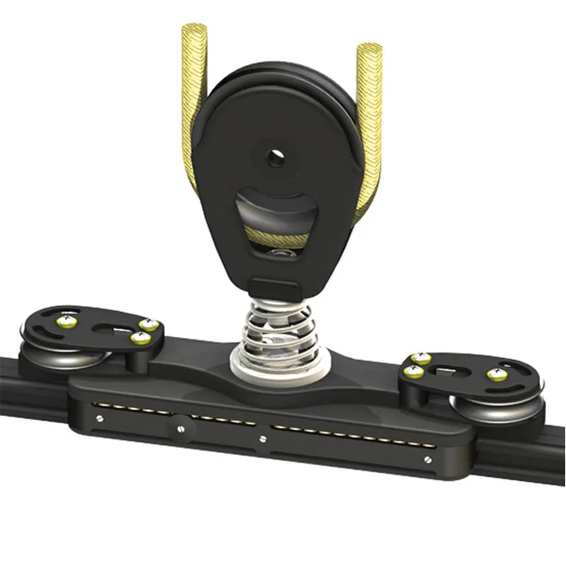 Car with 1 sheave. Ball bearing car in hard black anodized aluminum with four ball circuits: 2 Torlon ball circuits (lower) and 2 Delrin ball circuits (upper). The car will remain on the track even after ball bearing failure (overload). Side windows for easy maintenance and ball bearing cleaning and/or replacement. The car, the track and all components are extruded in high strength alloy and hard black anodized. (Steel parts: AISI 316)