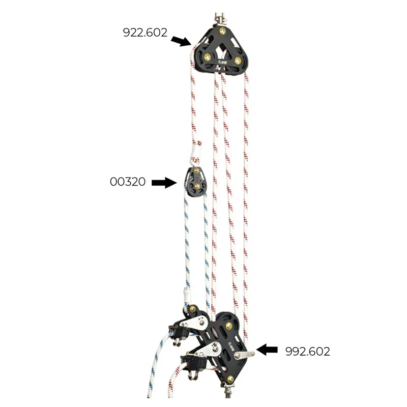 The image shows a two-speed 4:1/8:1 mainsheet system using the 992.602 as the bottom block and cleat system. Upgrading this to a 992.603 turns this into a 4:1/12:1 system.