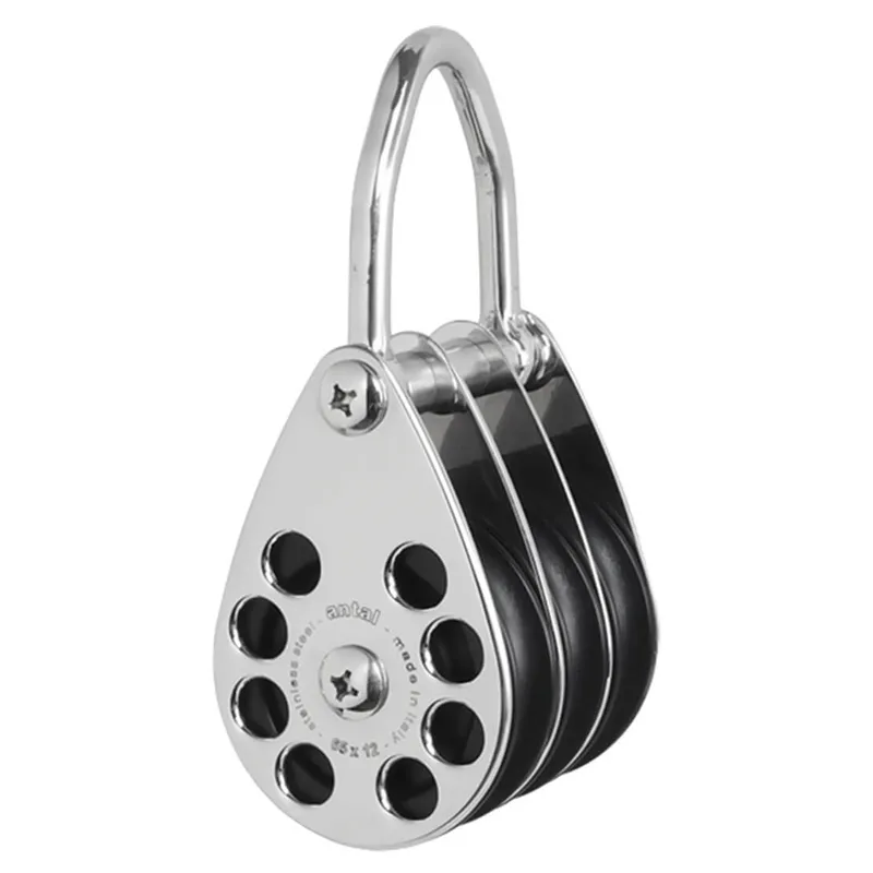 The line includes 6 different sizes with diameters from 65 to 180 mm and Safe Working Load up to 9000 kg. Perfectly polished AISI 316 stainless steel cheekplates and accessories, fully rounded corners for greater manageability, nuts and bolts replaced by pins and recessed screws to eliminate any protruding parts. The composite fibre sheave. The resin (aluminium on larger mod) sheave runs on the main Composite Fibre bearing and on a ground s.steel hub: low friction highloads - no lubricant required. The self-captive side ball bearing reduces the friction and makes disassembling, cleaning and maintenance very easy.