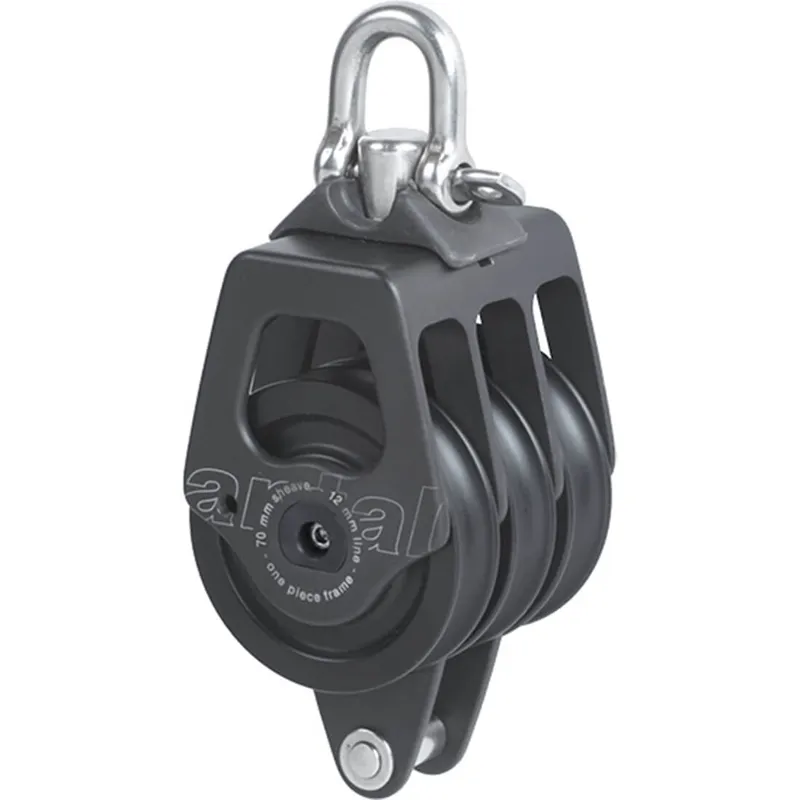 A complete range from 50 to 140 mm sheaves in single, double, triple, fiddle, and deck versions, for webbing or shackle connection. Sizes are based on the range of HR shackles available and on their safe working load (SWL). The HR swivel head. Made in high resistance stainless steel, with three positions: swivelling head, longitudinal lock and transversal lock. HR shackles included. The one-piece-frame. The one-piece aluminium extruded body is the strongest and lightest solution, no assembling pin rivets or screws and nuts. CNC machined - polished - hard black anodized and teflon coated. The composite fibre sheave. The resin (aluminium on larger mod) sheave runs on the main Composite Fibre bearing and on a ground stainless steel hub: low friction highloads - no lubricant required. The self-captive side ball bearing reduces the friction and makes disassembling, cleaning and maintenance very easy. Sheaves are supplied with the s.steel hub, they are available separately.