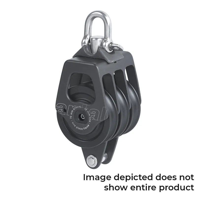 A complete range from 50 to 140 mm sheaves in single, double, triple, fiddle, and deck versions, for webbing or shackle connection. Sizes are based on the range of HR shackles available and on their safe working load (SWL). The HR swivel head. Made in high resistance stainless steel, with three positions: swivelling head, longitudinal lock and transversal lock. HR shackles included. The one-piece-frame. The one-piece aluminium extruded body is the strongest and lightest solution, no assembling pin rivets or screws and nuts. CNC machined - polished - hard black anodized and teflon coated. The composite fibre sheave. The resin (aluminium on larger mod) sheave runs on the main Composite Fibre bearing and on a ground stainless steel hub: low friction highloads - no lubricant required. The self-captive side ball bearing reduces the friction and makes disassembling, cleaning and maintenance very easy. Sheaves are supplied with the s.steel hub, they are available separately.