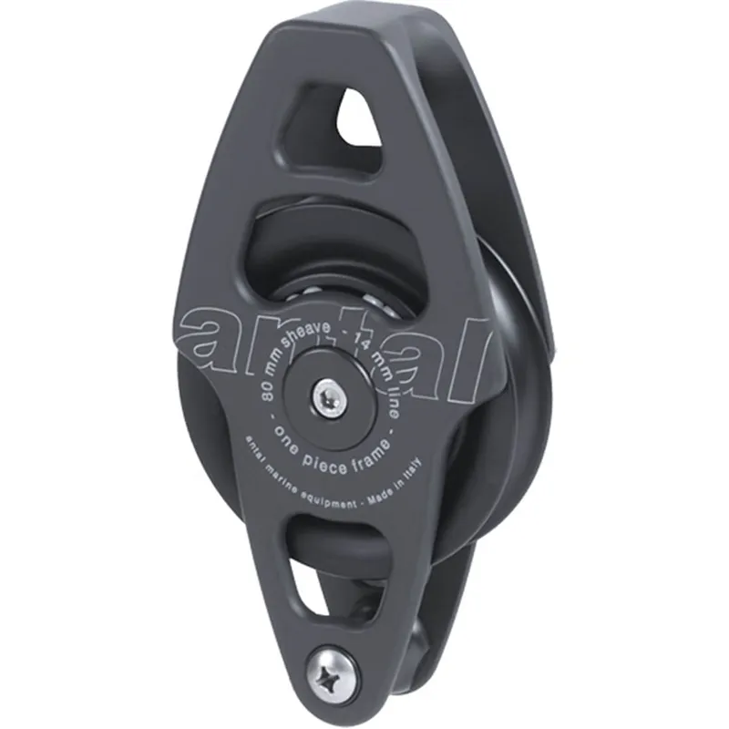 A complete range from 50 to 140 mm sheaves in single, double, triple, fiddle, and deck versions, for webbing or shackle connection. Sizes are based on the range of HR shackles available and on their safe working load (SWL). The HR swivel head. Made in high resistance stainless steel, with three positions: swivelling head, longitudinal lock and transversal lock. HR shackles included. The one-piece-frame. The one-piece aluminium extruded body is the strongest and lightest solution, no assembling pin rivets or screws and nuts. CNC machined - polished - hard black anodized and teflon coated. The composite fibre sheave. The resin (aluminium on larger mod) sheave runs on the main Composite Fibre bearing and on a ground stainless steel hub: low friction highloads - no lubricant required. The self-captive side ball bearing reduces the friction and makes disassembling, cleaning and maintenance very easy. Sheaves are supplied with the s.steel hub, they are available separately.