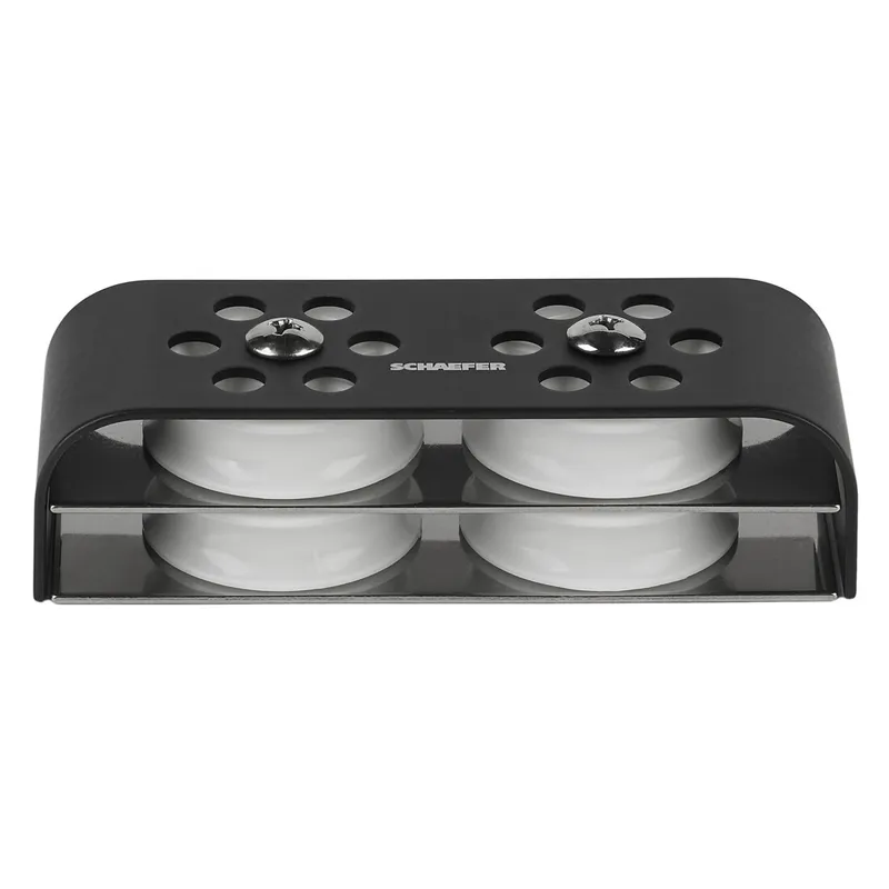 Schaefer Series 5 Aluminium deck organiser with 2 Sheaves over 2 sheaves. Stainless Steel base and anodised aluminium top strap provide a high strength base. Delrinâ„¢ sheaves ensure smooth operation and high strength.