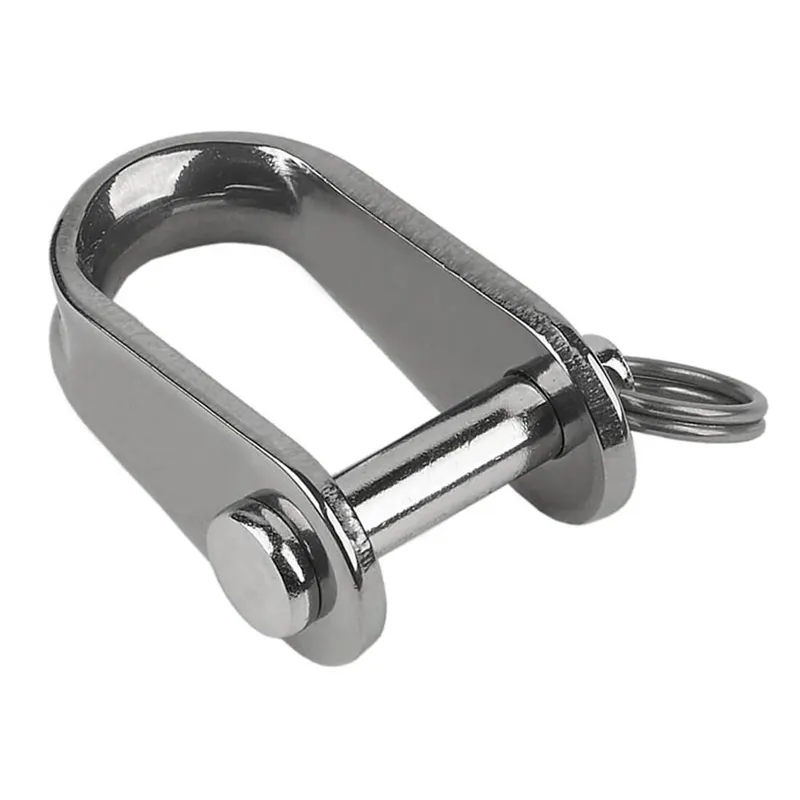 Schaefer's stamped D shackles from High quality Stainless Steel. These light weight shackles are provided with a stainless clevis pin and cotter ring.