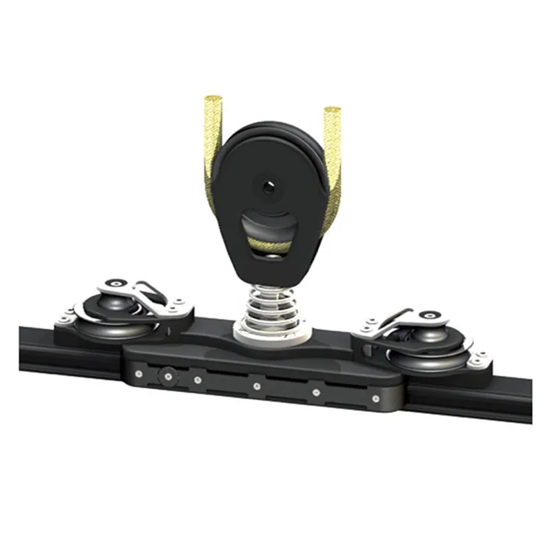Car with 1 sheave + becket. Ball bearing car in hard black anodized aluminum with four ball circuits: 2 Torlon ball circuits (lower) and 2 Delrin ball circuits (upper). The car will remain on the track even after ball bearing failure (overload). Side windows for easy maintenance and ball bearing cleaning and/or replacement. The car, the track and all components are extruded in high strength alloy and hard black anodized. (Steel parts: AISI 316)