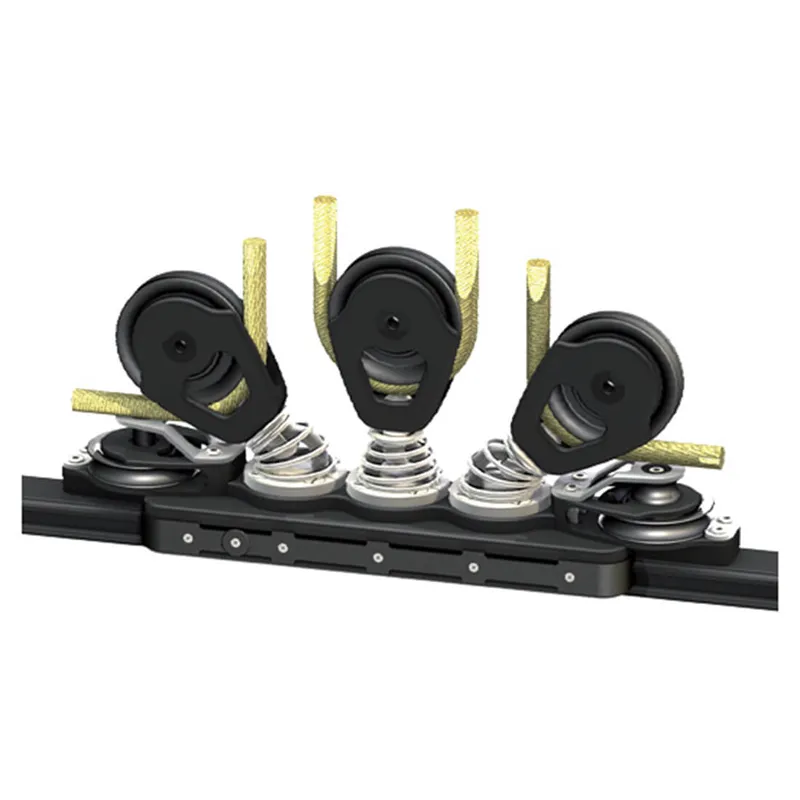 Car with 1 sheave + becket 3 blocks. Ball bearing car in hard black anodized aluminum with four ball circuits: 2 Torlon ball circuits (lower) and 2 Delrin ball circuits (upper). The car will remain on the track even after ball bearing failure (overload). Side windows for easy maintenance and ball bearing cleaning and/or replacement. The car, the track and all components are extruded in high strength alloy and hard black anodized. (Steel parts: AISI 316)
